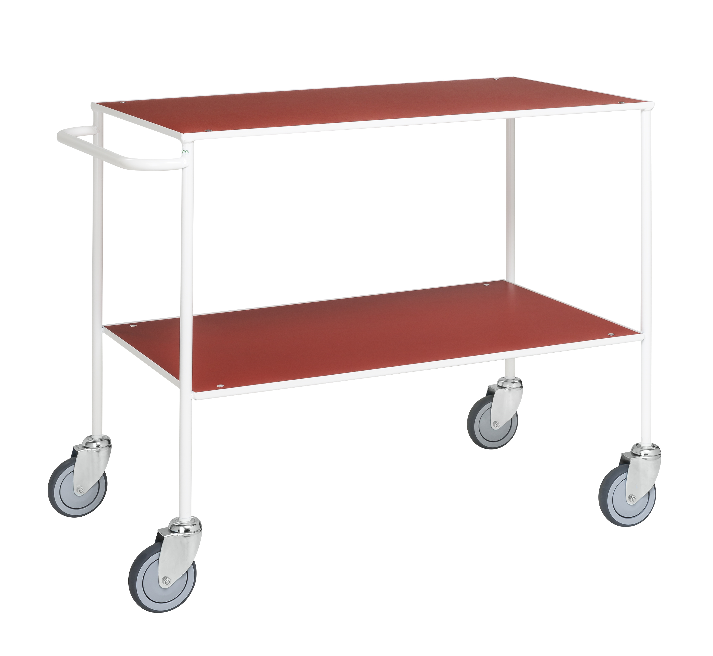 Pulverlakkert med laminathyller Høyde til øverste hylle 850 mm Avstand mellom hyller 450 mm 4 dreibare hjul 125 mm Kapasitet: 150 kg
