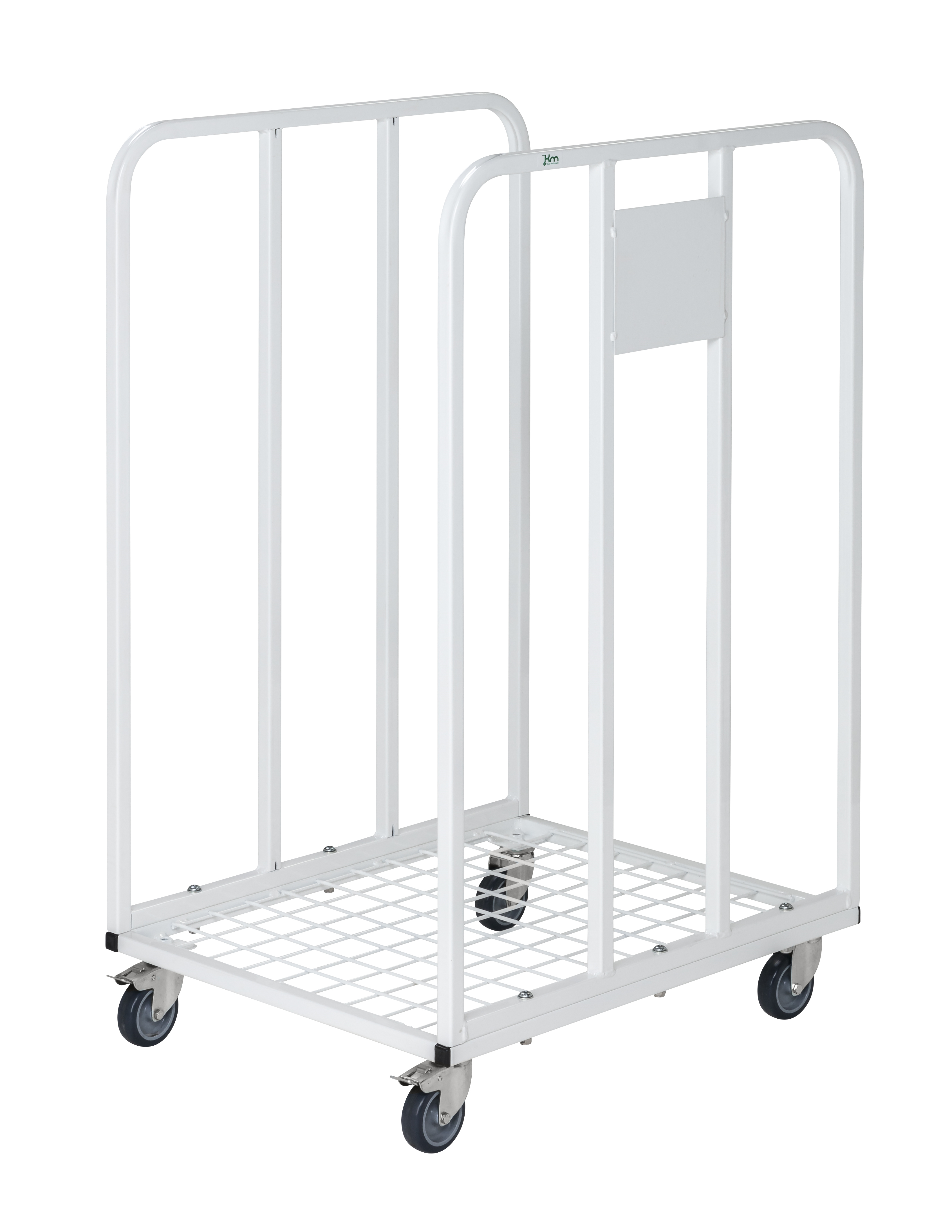 Små, fleksible 2-sidige hvite, pulverlakkerte rullecontainere for kontorer med 50 mm maskevidde nederst. 4x 100 mm svingbare hjul, 2 med brems. Ideell for lagring / transport av sammenbrettede esker / lett kartong.