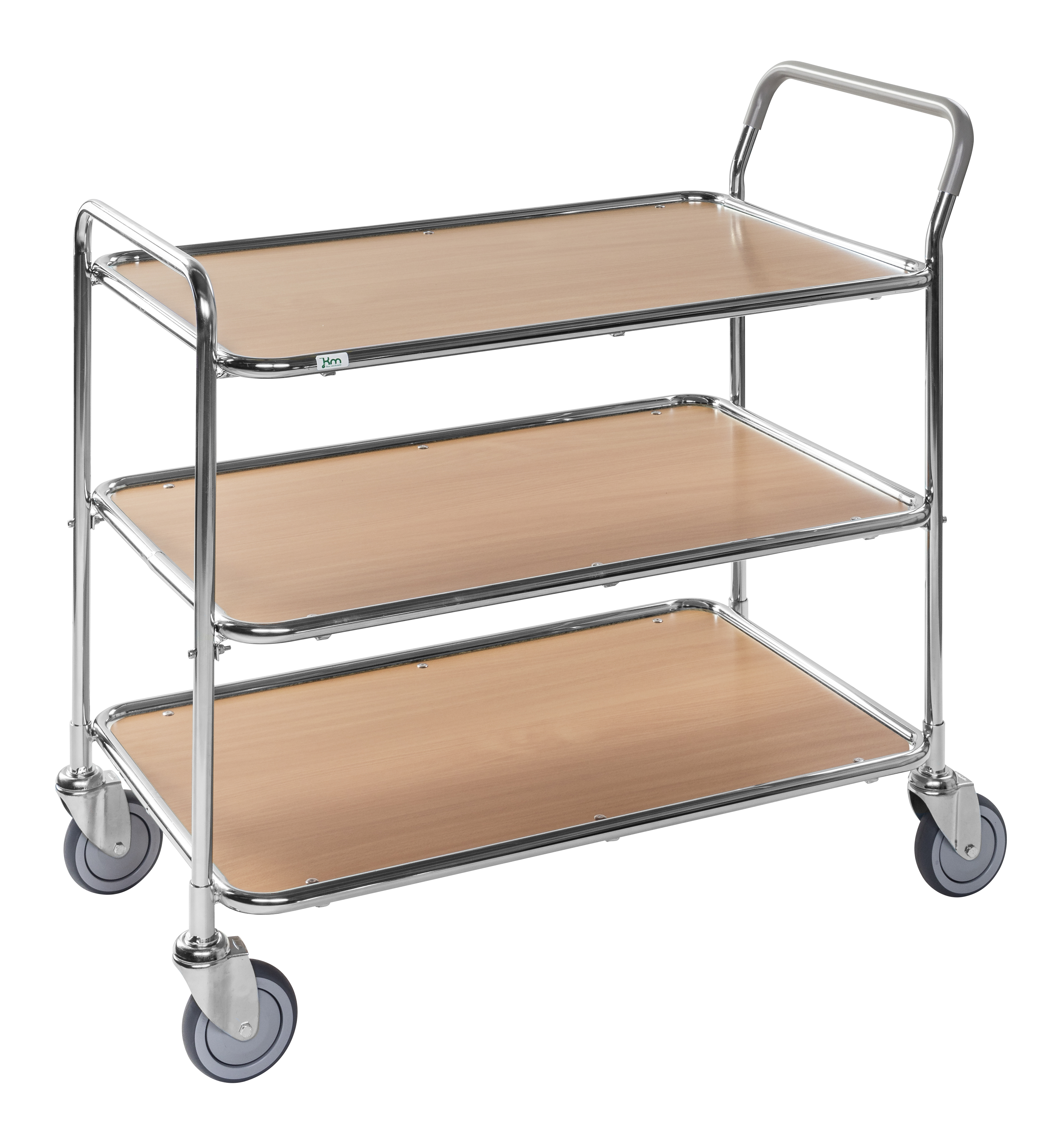 Mindre serveringstralle med 3 hyller. Håndtak i plast gir et behagelig grep og hindrer også at hendene blir kalde. Laminerte hyller.