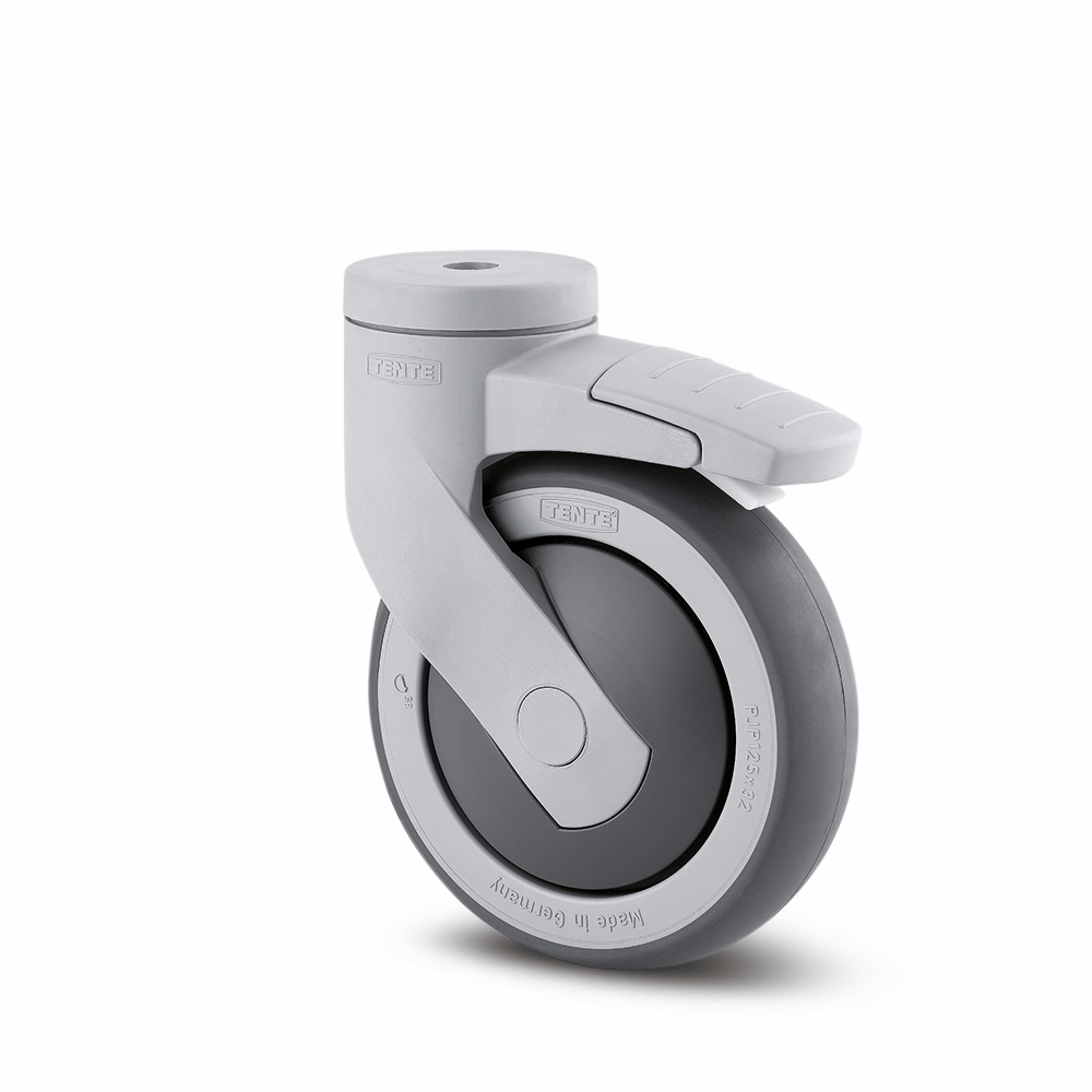 Felg: Polypropylen (PP), Bane: TENTEprene,grå termoplastisk gummi svertefri, rillekulelager