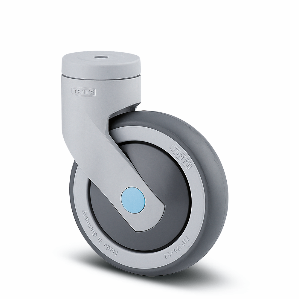 Svingbart hjul, gaffel i syntetisk material av høy kvalitet, inngående metalldeler er tilvirket i rustfritt stål, dobbel kulelager i svingkransen, Bolthull. Felg: Polypropylen (PP), Bane: TENTEprene,grå termoplastisk gummi svertefri, rustfritt rillekulelager,